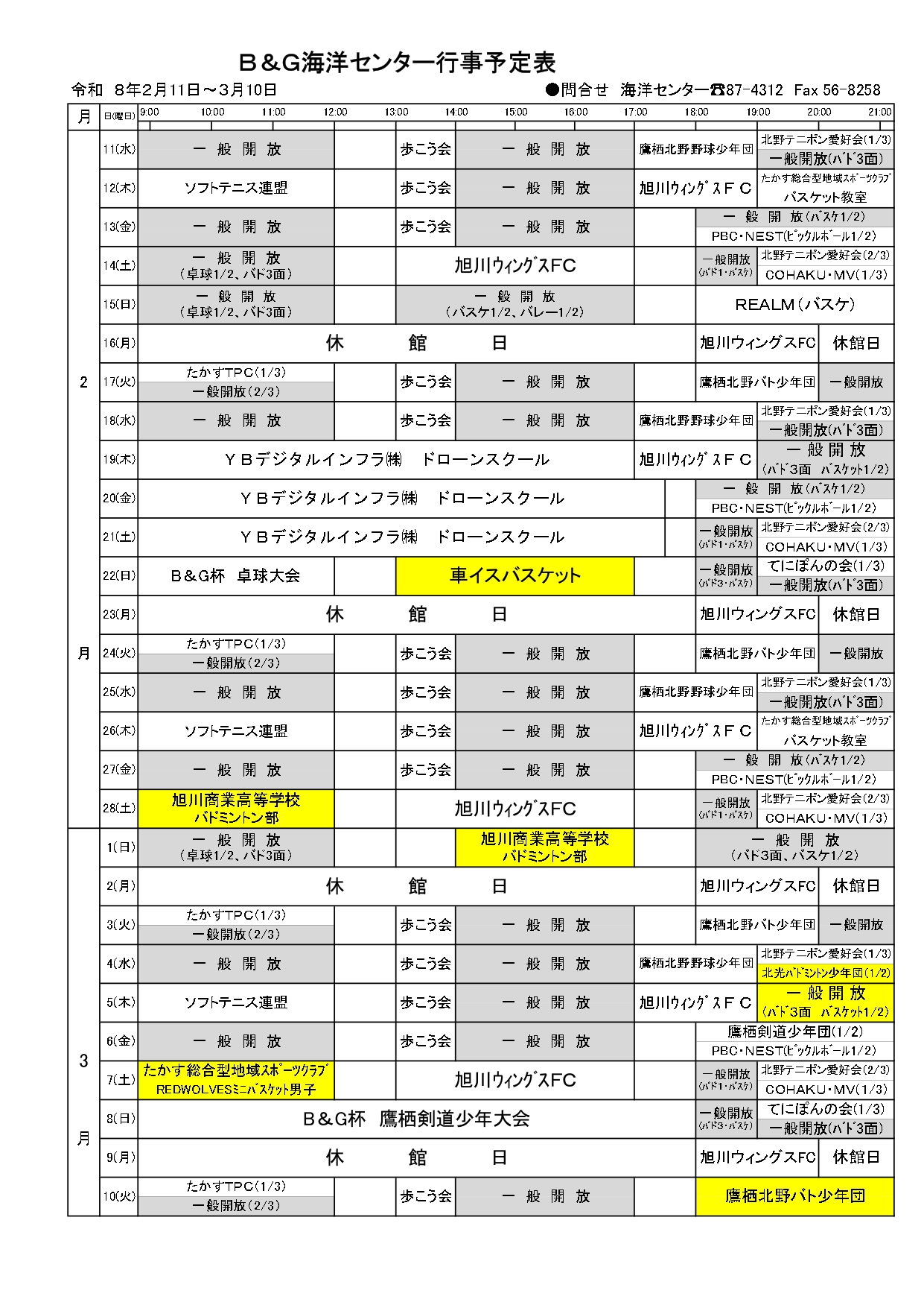 - 全町、管内、全道的スポーツ大会、および町の事業もしくは公共的団体の事業で使用する場合は、前もって日程を確保することがあります。